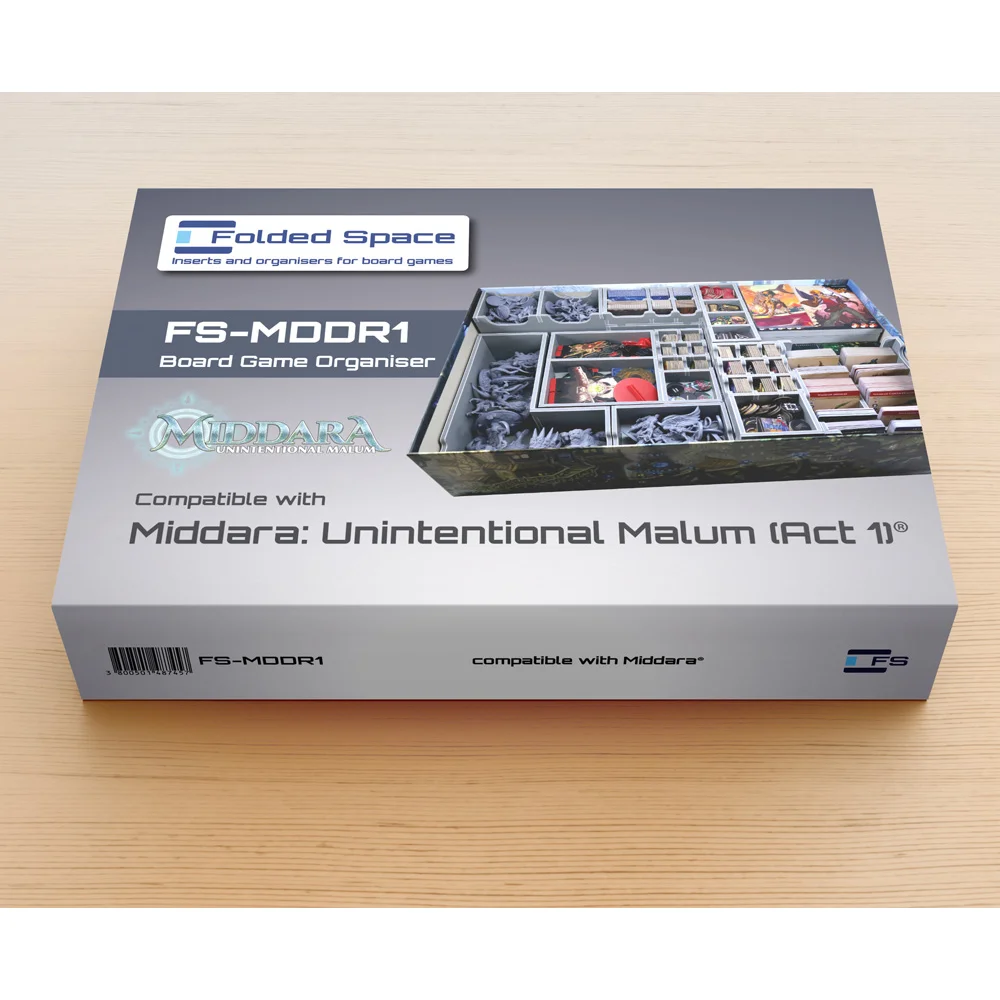 Official insert compatible with Middara: Unintentional Malum Act 1®. The design provides both efficient storage and improved game play. The trays can be utilised during the game, and they greatly aid set-up and clear-away times. The rule books act as a lid on top of the trays.