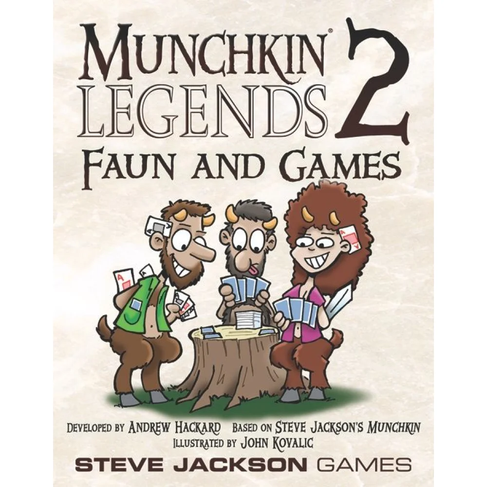 Munchkin Legends 2: Faun and Games is a 56-card expansion for Munchkin Legends (and other Munchkin games) that introduces a new race β the Faun β as well as more jokes and puns based on figures from mythology and history. You can use the “Spear of Destiny” to fight “J.R.R. Trollkin” or fend off the “Wendigo” with your “Hell Toupee”.